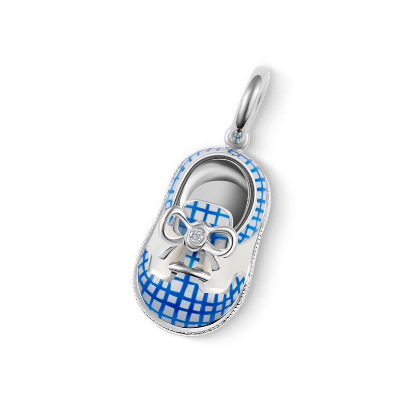 It's easy to fall in love with this fun and amusing blue gingham baby saddle shoe charm by Aaron Basha. A beautiful dark blue enamel is interwoven with light blue for the perfect design contrast. Topped off with a white enamel saddle on an 18kt white gold shoe with .01 carat diamond bow accent, this fabulous Aaron Basha charm is sure to set tongues wagging about your wonderful taste in fashion!